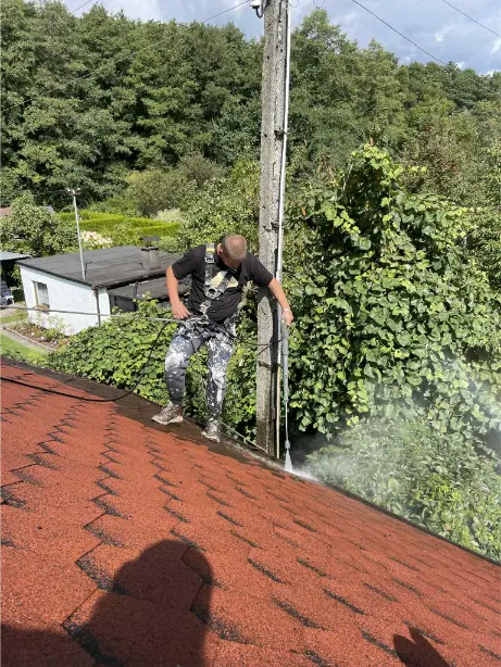 Do czyszczenia wykorzystujemy techniki alpinistyczne oraz specjalistyczne myjki wysokociśnieniowe. Dzięki temu możemy pracować w trudno dostępnych miejscach i usuwać nawet najbardziej uporczywe zabrudzenia. Każde zlecenie dopasowujemy do rodzaju powierzchni – stosujemy inne metody dla dachówki, blachy czy elewacji tynkowej, aby nie uszkodzić materiału.